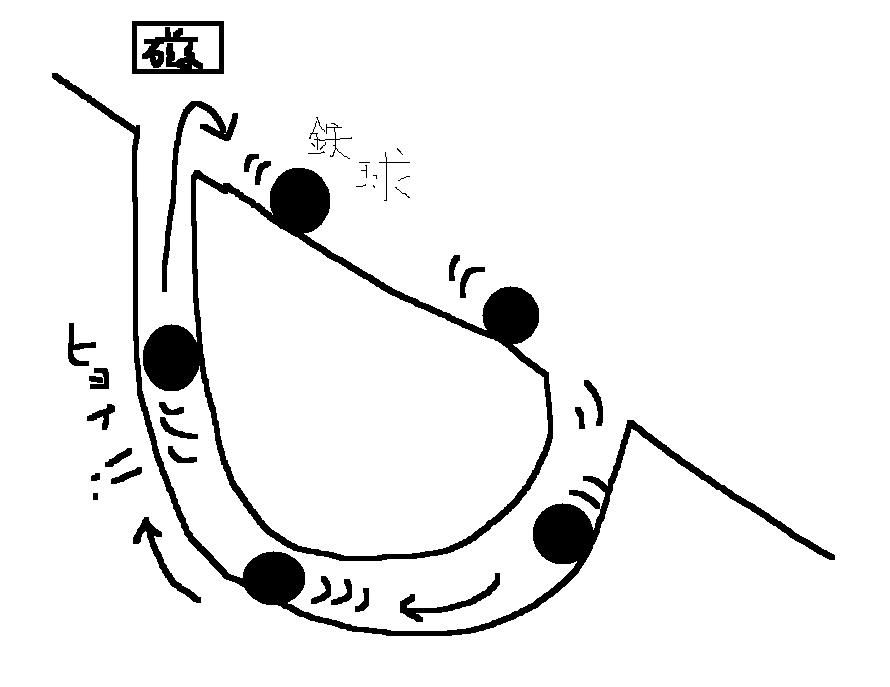鉄球は外の坂を転がらずに磁石にくっついて取れなくなる