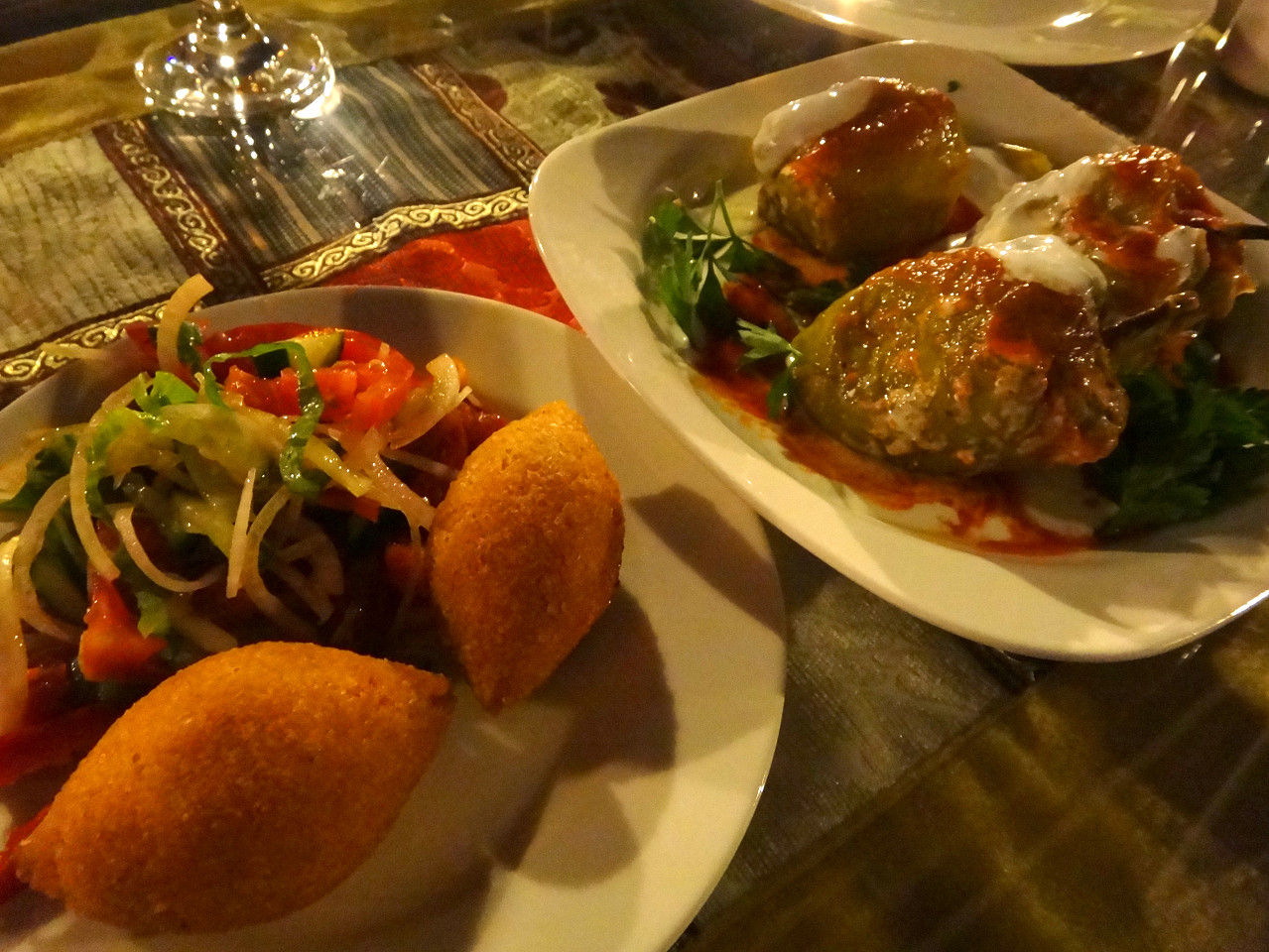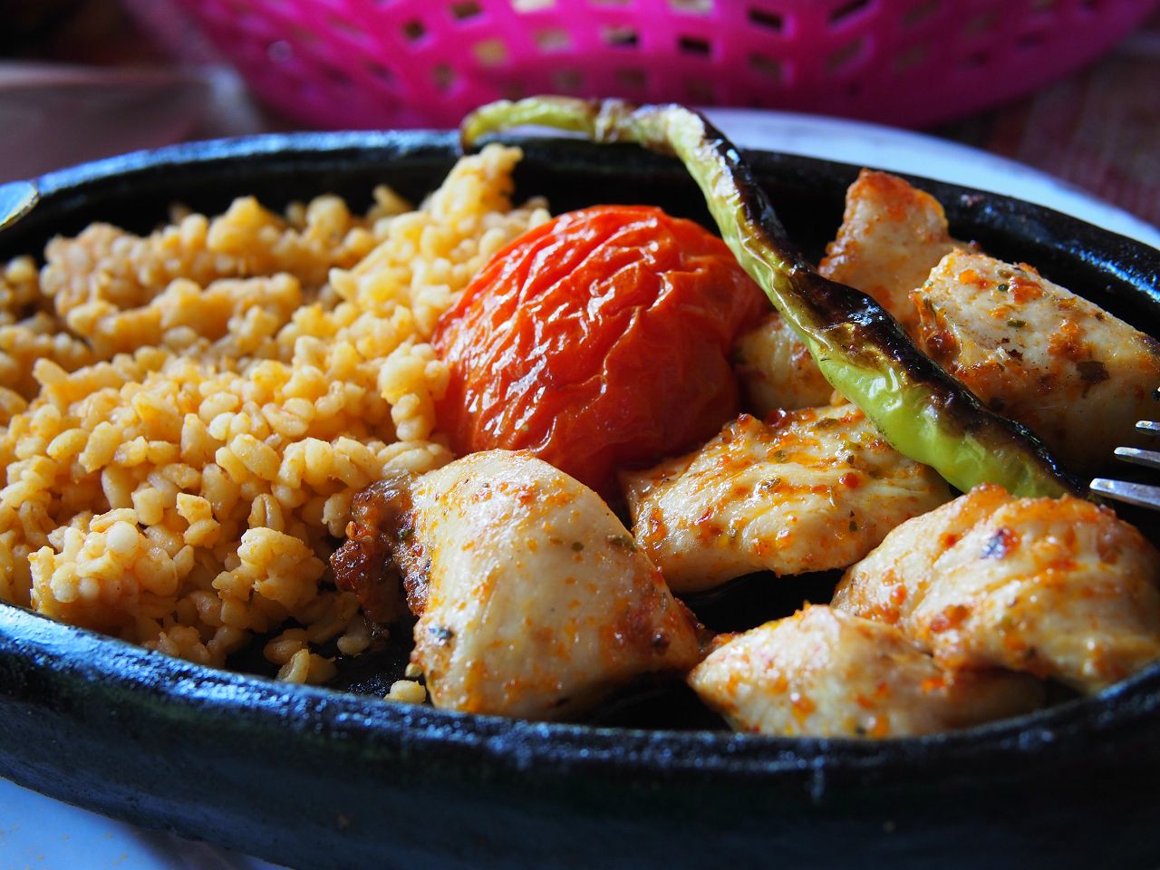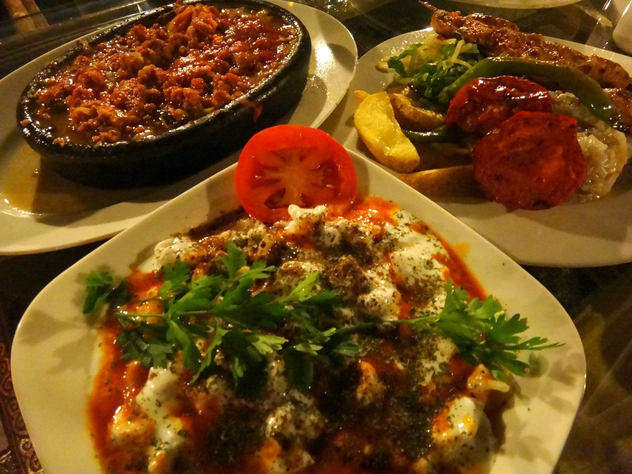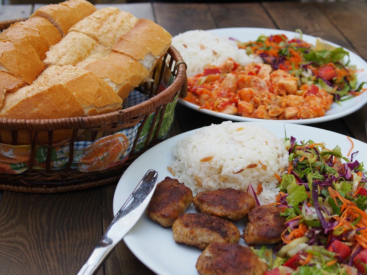 手前が小さなハンバーグ「キョフテ」、奥は鶏肉とトマトを炒めたもの