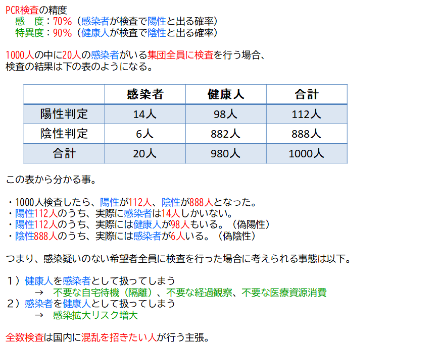 偽陽性が大量に出るからクラスターが掴めなくなるわかりやすい説明をマスコミ等で聞いたことがない 簡単な話だが