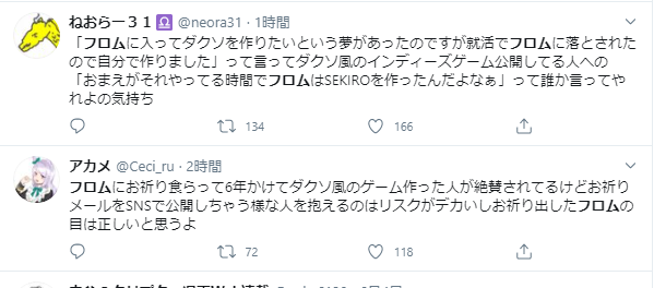 フロム信者なのかゲーム系の専門学生なのかわからんけど普通の人間は凄いねで終わるし個人としては立派な成果物だろ