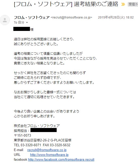 昨日から話題の、某社に落ちてからの数年でゲーム作った話ですけど、ああいうメールのスクリーンショットを貼る人は実力関係なく厳しいです。