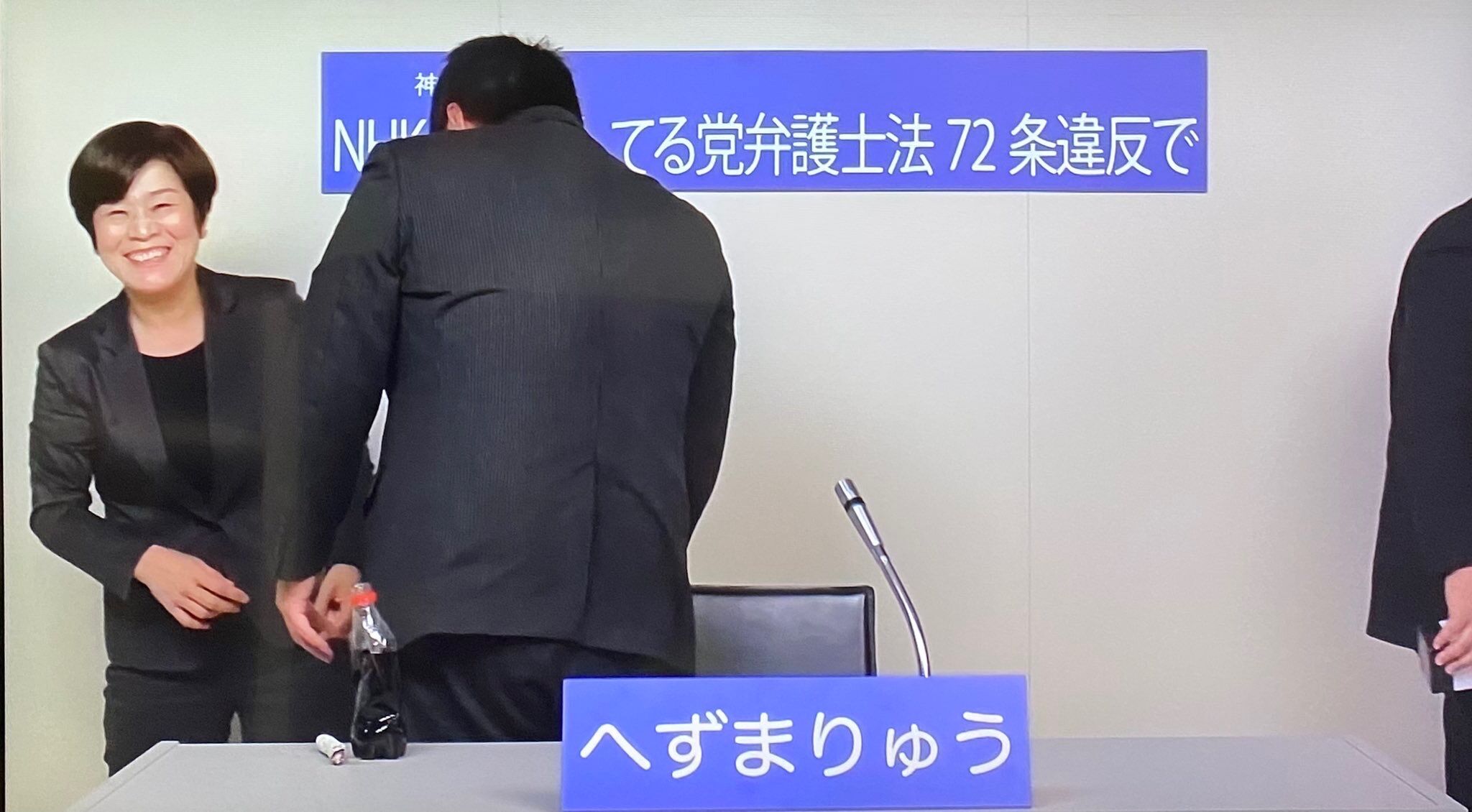 すると後方にいた手話通訳士の女性にへずま氏は「ピピピ~、山口県から来ましたへずまりゅうです! コラボレーションお願いします。メントスコーラお願いします。あなたのことを愛しています!」とコーラにメントスを入れて、発泡させる突撃行為に及んだのだ。