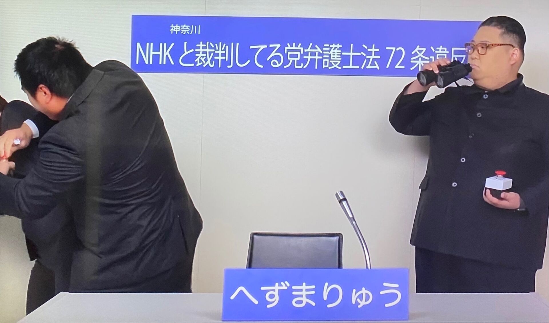 小選挙区神奈川県の政見放送で、NHK党は神奈川15区に渡辺麻里子氏(45)が立候補。机の上には「渡辺マリコ」の名前が書かれたプレートが置かれていた中、へずま氏が北朝鮮の金正恩朝鮮労働党総書記のそっくりさんでティックトッカーのぷりん将軍とともに登場。渡辺氏のプレートを投げ飛ばし、自分の名前が入ったプレートと入れ替えるや、おもむろにコーラとメントスを取り出した。