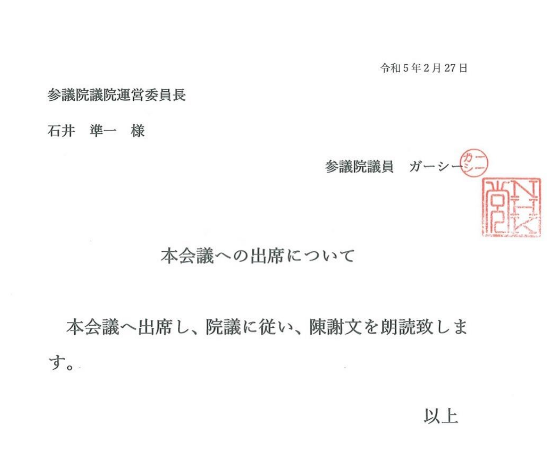 NHK党のガーシー参院議員(51、本名・東谷義和)が27日、参院議院運営委員会に「本会議へ出席し、院議に従い、陳謝致します」と文書で回答した。関係者が明らかにした。
