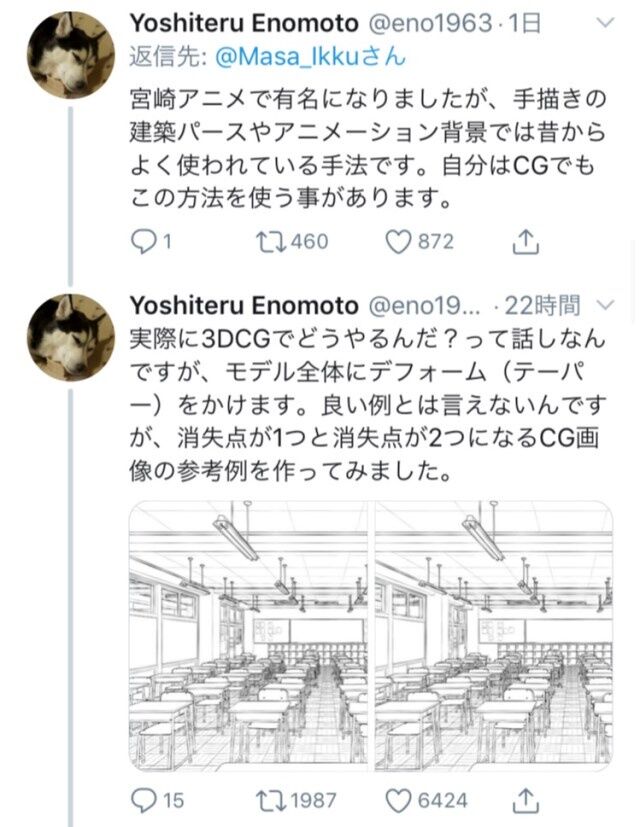透視図法といえば、学生の頃、トトロのレイアウトに定規を当てたら一点透視のはずなのに消失点が2つあって、これはどういうことなのかとかなり悩んだ記憶がある