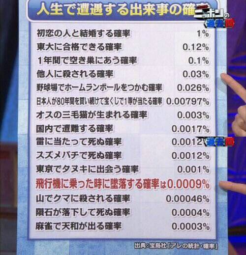 東京23区内で何度もタヌキ見たことあるし、クマに殺される人も天和上る人も実際にいるけど、隕石に当たって死んだ人は(記録上)いないし、東大には合格できた俺も初恋の人には振られたし