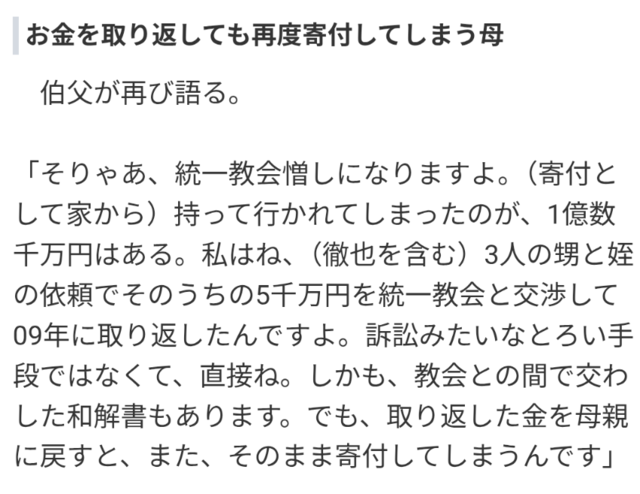 叔父に引き取られて母親とは離れてたし叔父が裁判起こして統一から5000万円は取り戻したし