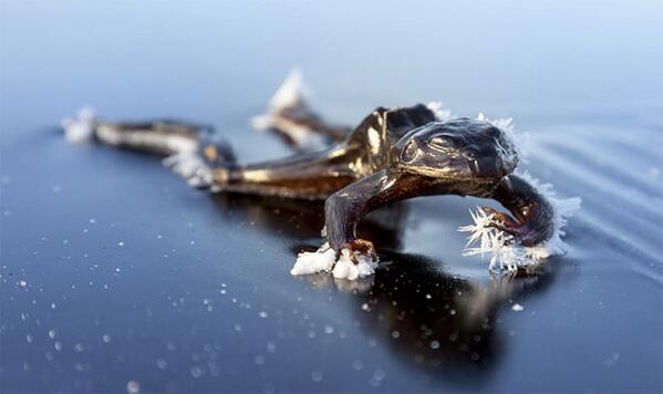 なんだこれ、冬眠しそびれて凍ったカエル?