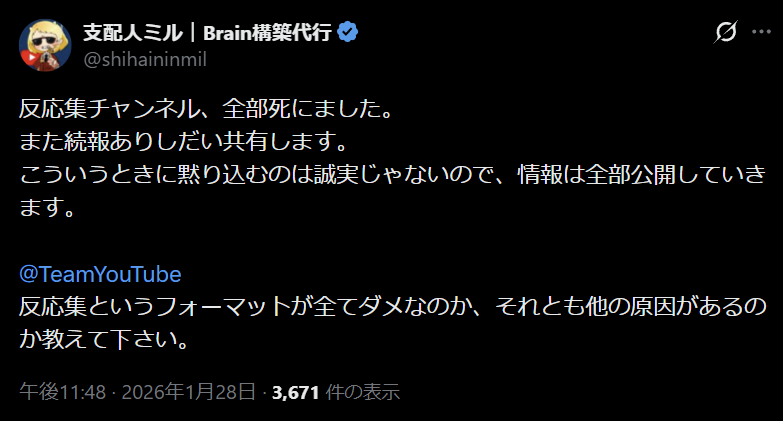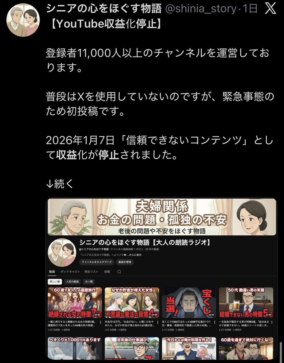 引用元: ・【悲報】YouTube、量産型と認定したチャンネルを収益停止どころか次々とチャンネルごと削除へ [902666507]