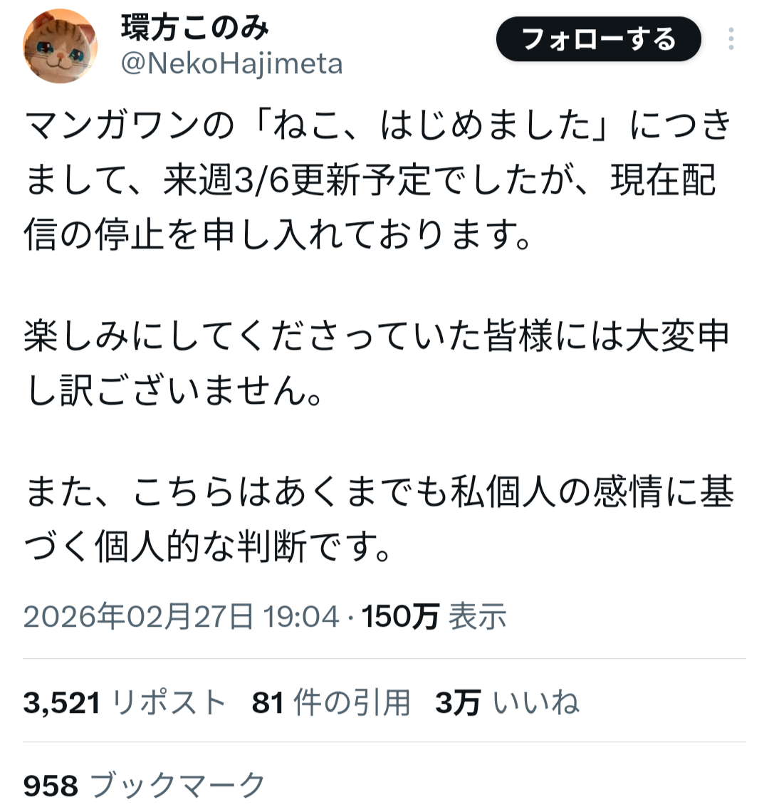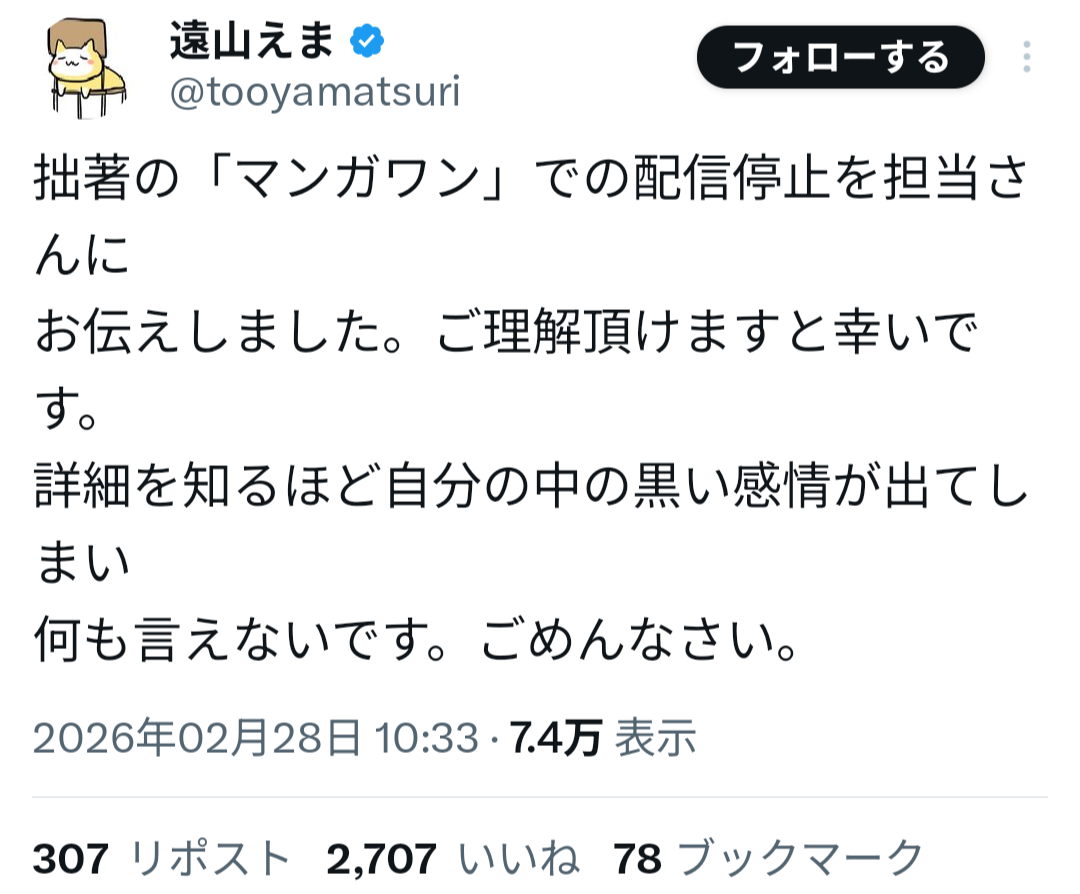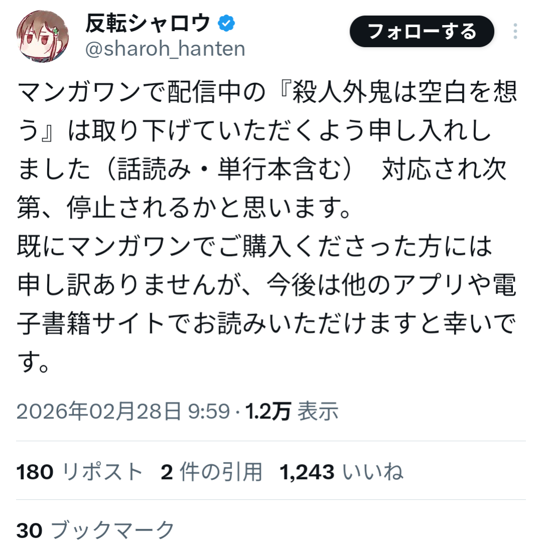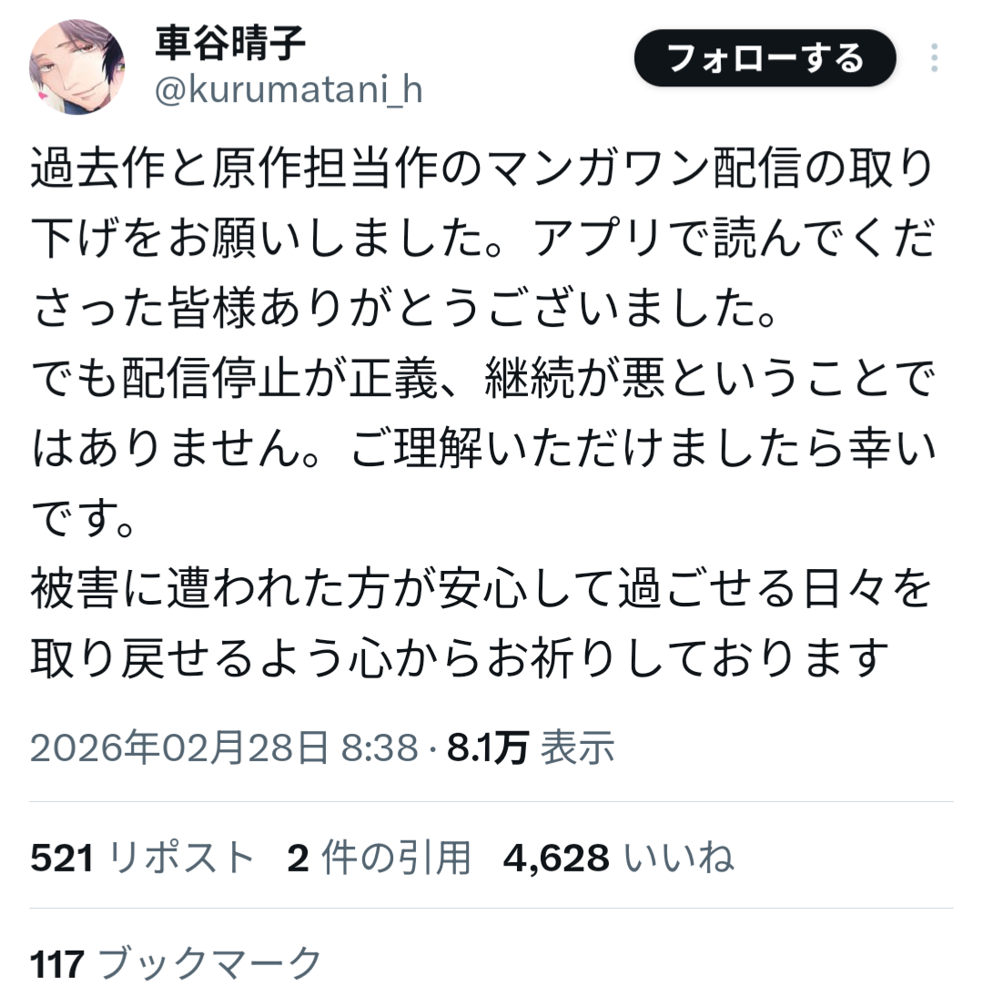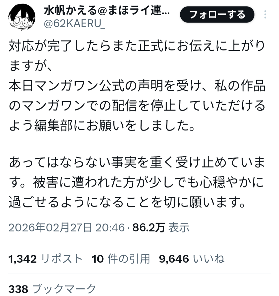 山本氏は過去、女子生徒への性的加害事件により刑事処分を受け、当時の連載作品が終了していた経緯がある。しかしその後、別ペンネームで活動を再開し、マンガワン編集部が新たに作品を起用していたことが明らかになった。
