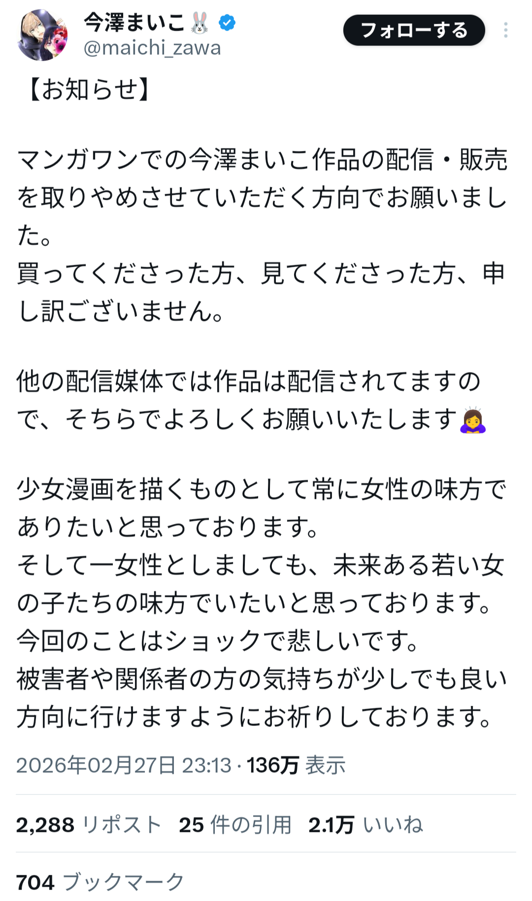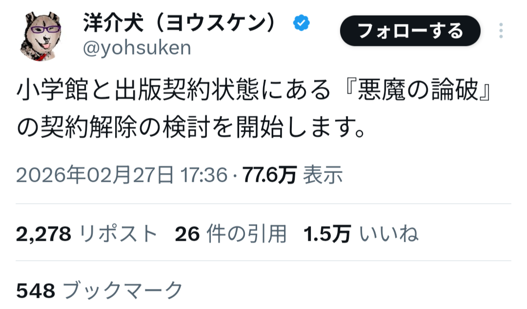 小学館は声明で、過去の問題を把握していたにもかかわらず起用に至った点について「判断および確認体制に不備があった」と説明し、「本来であれば起用すべきではなかった」として謝罪した。