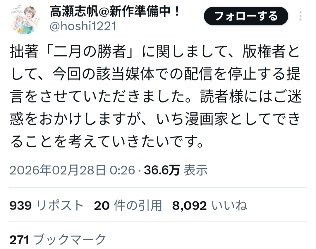 今回の問題は一作家の不祥事にとどまらず、出版社の倫理観やコンプライアンス体制、編集部のガバナンスの在り方を問う事態へと発展しており、漫画業界全体への影響が注目されている。