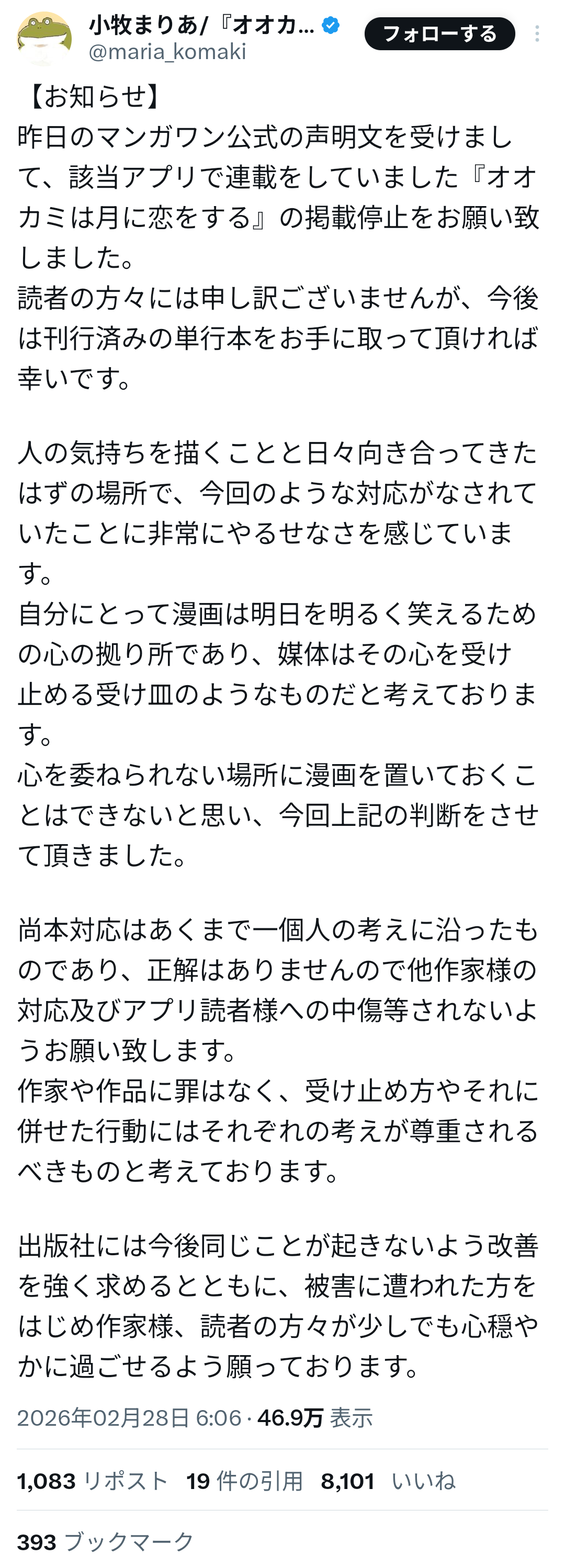 日本漫画家協会も声明を発表し、本件を「漫画業界全体に関わる重要な問題」と指摘。出版社側に対し、経緯の説明と再発防止策の提示を求めた。