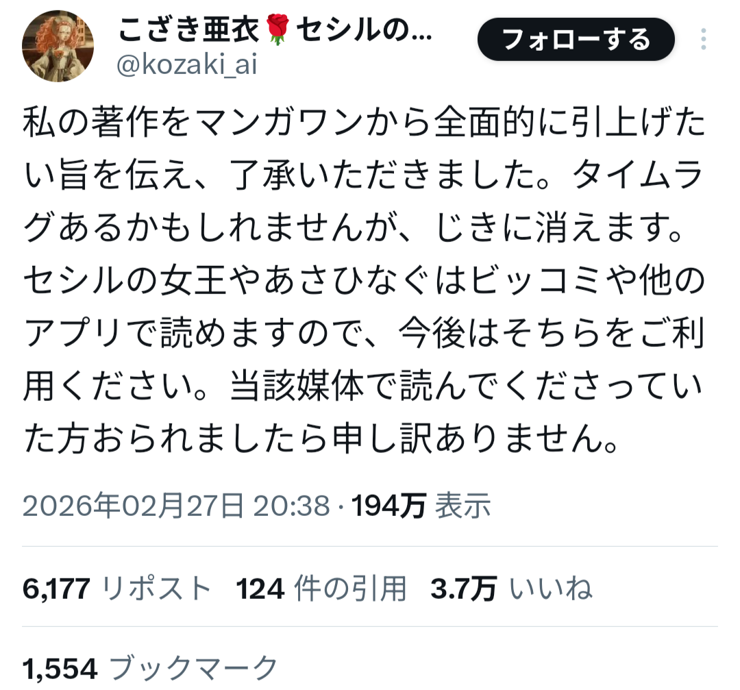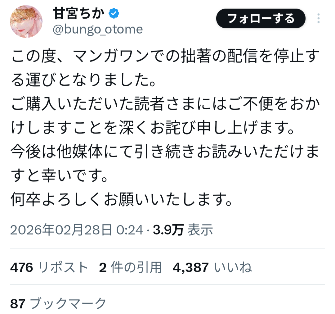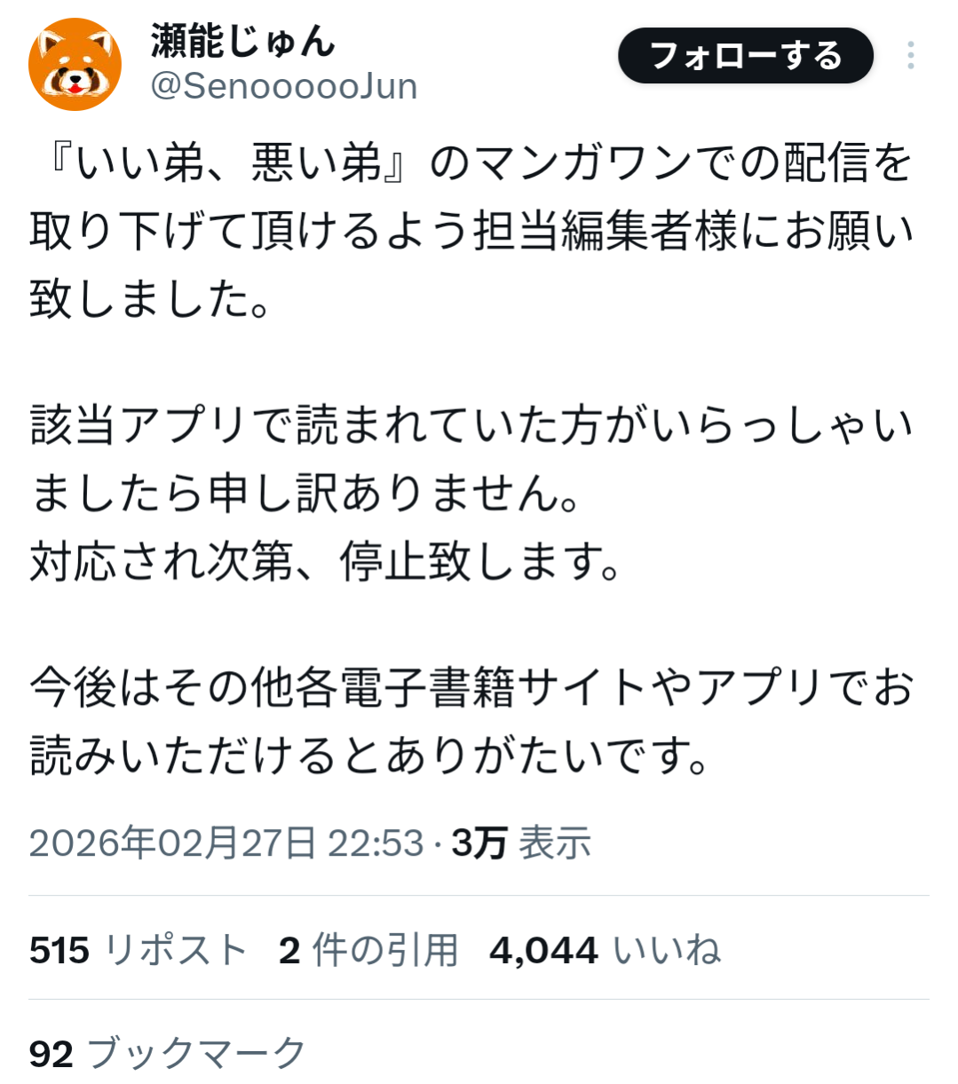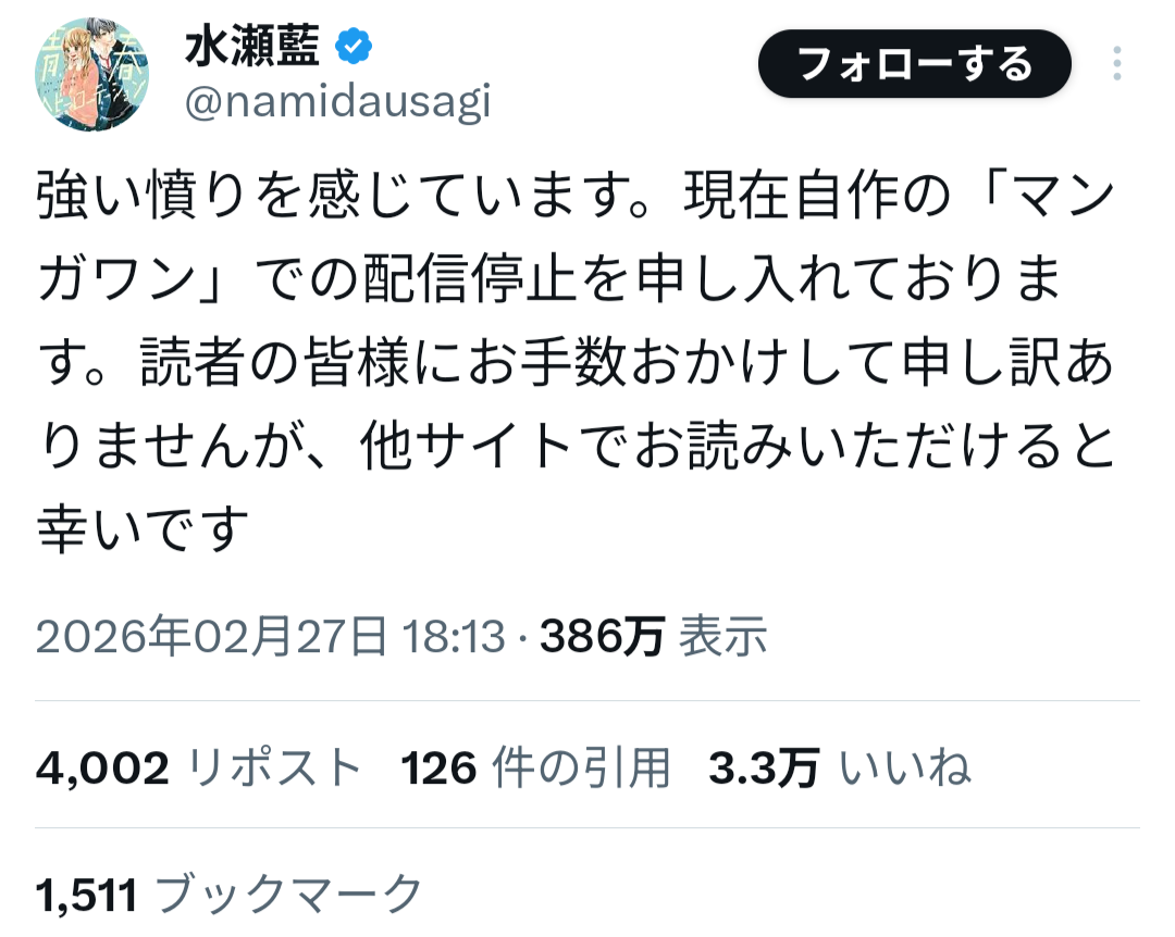 小学館の漫画アプリ「マンガワン」を巡り、漫画業界全体に波紋が広がる騒動が発生している。連載作品の突然の配信停止をきっかけに、編集部の対応や起用判断が問題視され、作家や読者の間で批判が拡大している。