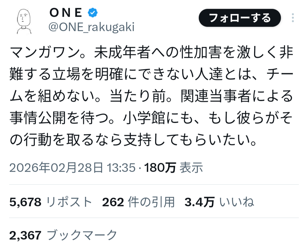 問題の発端は、マンガワンで連載されていた漫画『常人仮面』の配信停止だった。小学館はその後、原作者「一路一」が、過去に性加害事件で罰金刑を受けた漫画家・山本章一と同一人物であることを認め、公式に謝罪した。